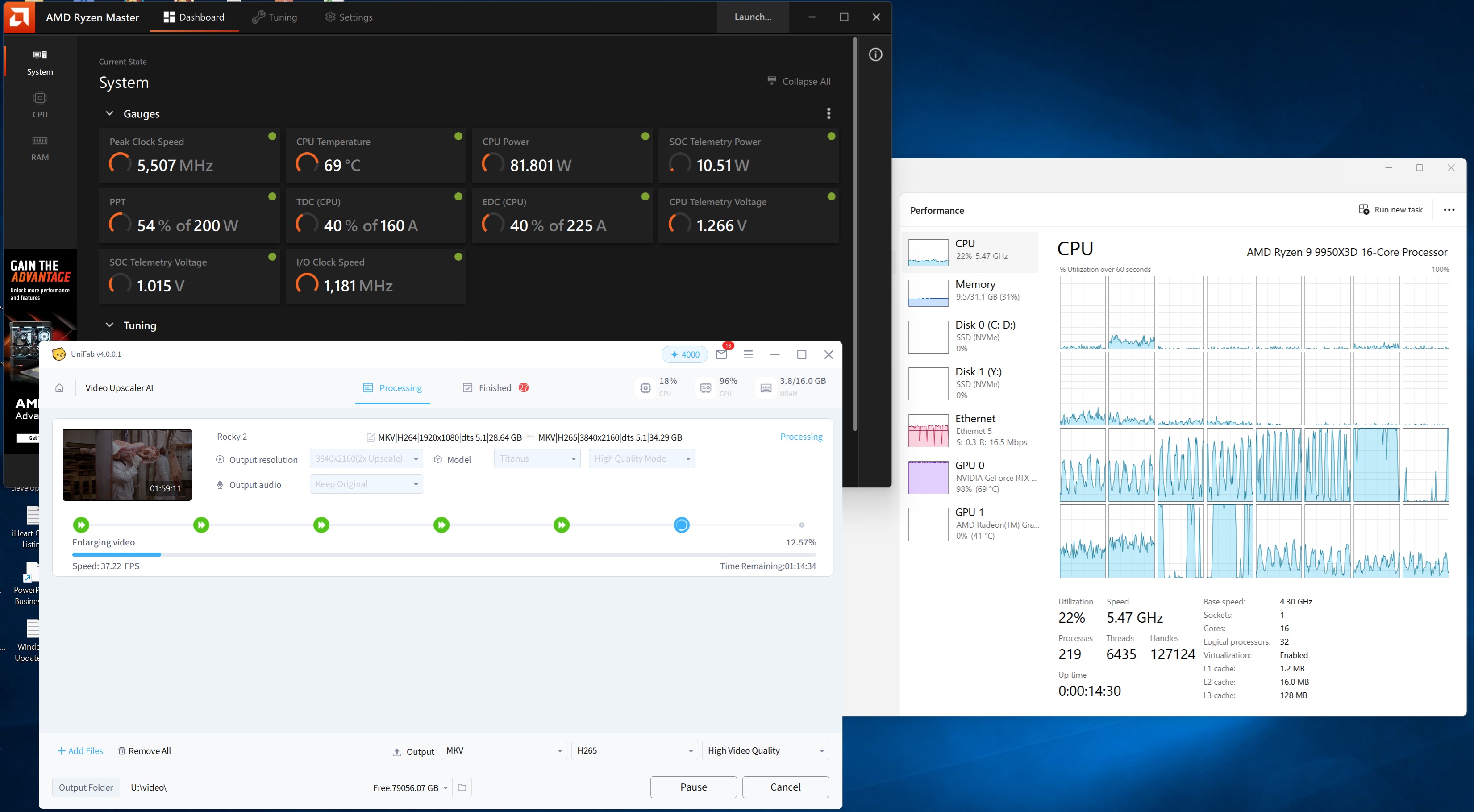 I took it for a spin doing AI upscaling of 1080P content to 4K. The results were impressive and the temperature stayed under 70 degrees C. A full stress test pulling 165W across all logical cores only took the temperature to 75 degrees.